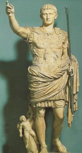 La statue d’Auguste dite «de Prima Porta» tire son nom de la localité où elle a été trouvée le 20 avril 1863, dans la villa de Livie, au nord de Rome. La statue en marbre actuelle devait avoir probablement pour modèle une statue en bronze, exécutée en 20 avant JC ou immédiatement après, et qui fut copiée en marbre pour Livie à la mort d’Auguste, en 14 après JC ou peu après. Elle est actuellement conservée dans l’aile du Braccio Nuovo, au musée du Vatican à Rome.
