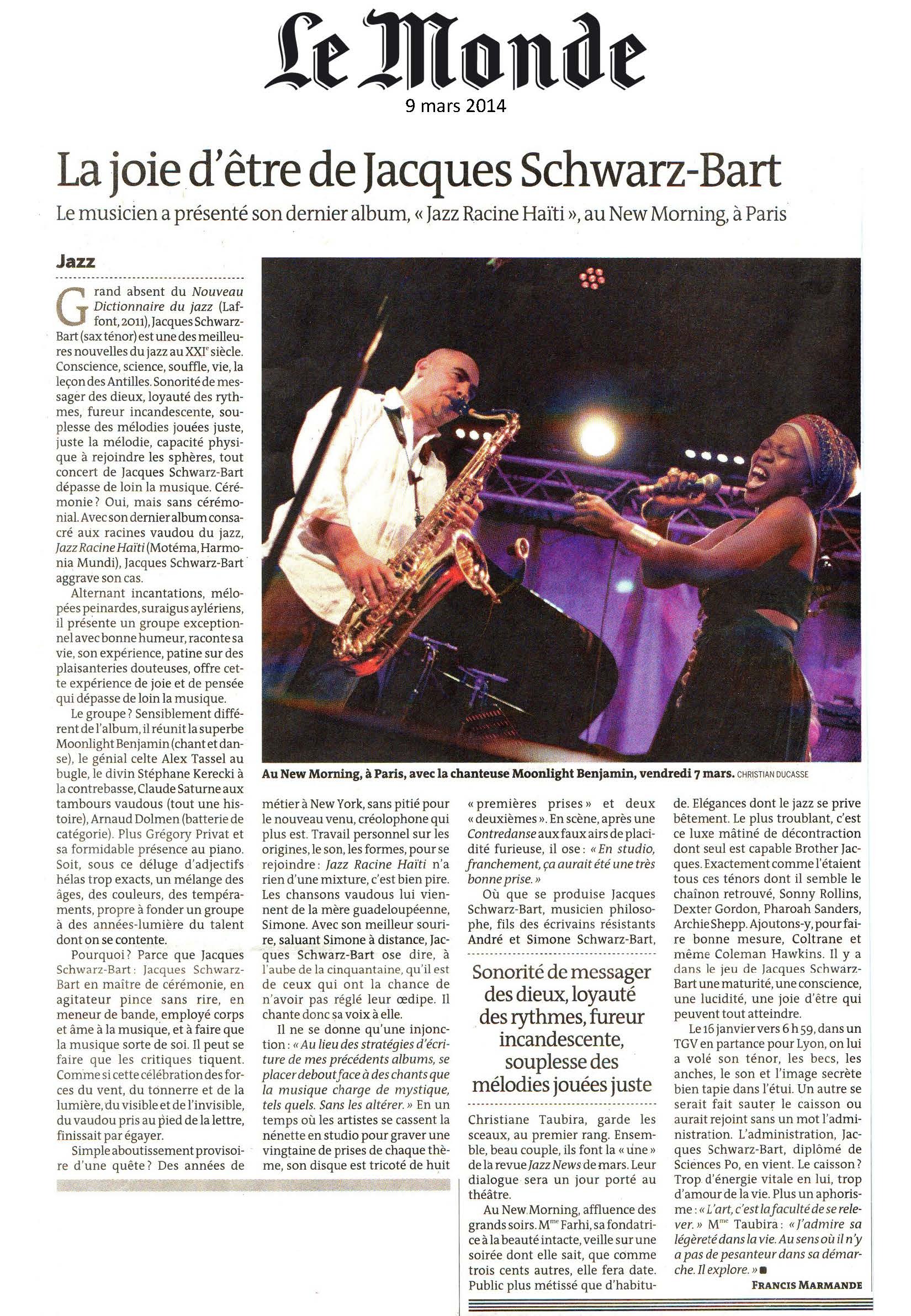 JAZZ – Jacques Schwarz-Bart au New Morning JEAN-CLAUDE HALLEY Actualité, Jazz, Musique 21 mars 2014 1 Minute Sonorité de messager des dieux, loyauté des rythmes,fureur incandescente, souplesse des mélodies jouées juste ! Merci à René CAZIMIR-JEANON Partager : Cliquer pour partager sur X(ouvre dans une nouvelle fenêtre) X Cliquez pour partager sur Facebook(ouvre dans une nouvelle fenêtre) Facebook J’aime chargement… Similaire Publié par JEAN-CLAUDE HALLEY Retraité, tout un programme Voir tous les articles par JEAN-CLAUDE HALLEY Publié 21 mars 2014