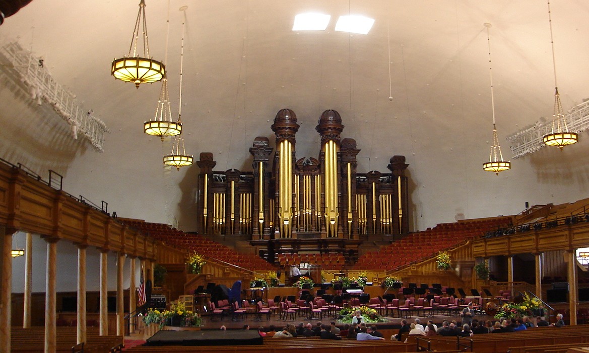 Dans ce grand auditorium se trouve l’orgue du Tabernacle qui se compose de 11 623 tubes dont quelques tubes dorés sont taillés à la main dans du bois provenant d’arbres de l’Utah.Le » Notre Père «