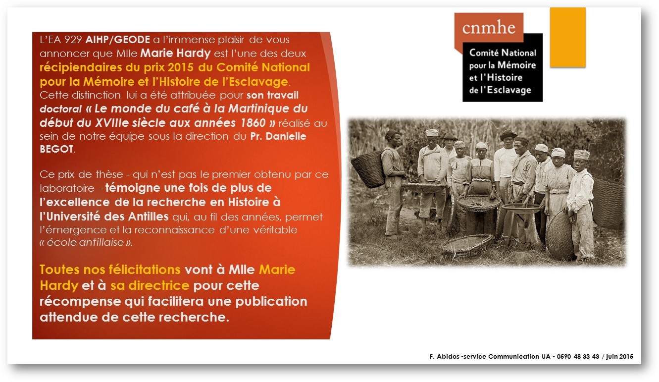 Prix 2015 du Comité National pour la Mémoire et l’Histoire de l’esclavage ! JEAN-CLAUDE HALLEY Actualité, Esclavage, Thèse 3 juillet 2015 1 Minute Nous adressons nos félicitations à la récipiendaire et sa Directrice de thèse. Partager : Partager sur X(ouvre dans une nouvelle fenêtre) X Partager sur Facebook(ouvre dans une nouvelle fenêtre) Facebook J’aime chargement… Similaire Publié par JEAN-CLAUDE HALLEY Retraité, tout un programme Voir tous les articles par JEAN-CLAUDE HALLEY Publié 3 juillet 2015