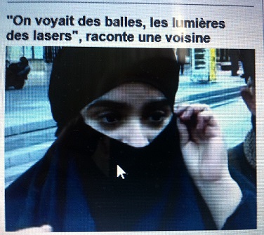 Une femme en burqa noire, le visage masqué, exemple de l’intégration réussie. Elle a pu cependant prononcer en français quelques mots à travers sa bavette mortuaire pendant que ses coreligionnaires échangeaient des coups de feu avec les forces de l’ordre, et qu’une consœur, sans doute également en burqa (c’est plus commode pour masquer une ceinture d’explosifs) se faisait désintégrer en désespoir de n’avoir pu le faire au milieu d’une foule d’innocents.