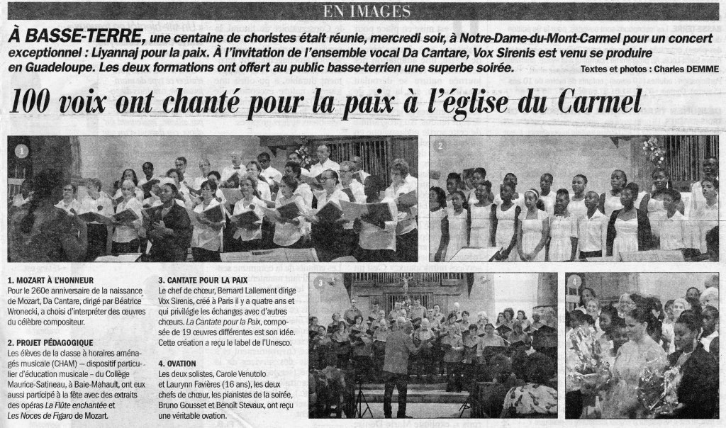 Au cas où vous ne les auriez pas, voici le reportage en photos de FRANCE-ANTILLES pour le concert du Carmel, et l’article de son supplément du samedi TV-Magazine, en date du 30 avril, qui annonçait la venue de Vox Sirenis.