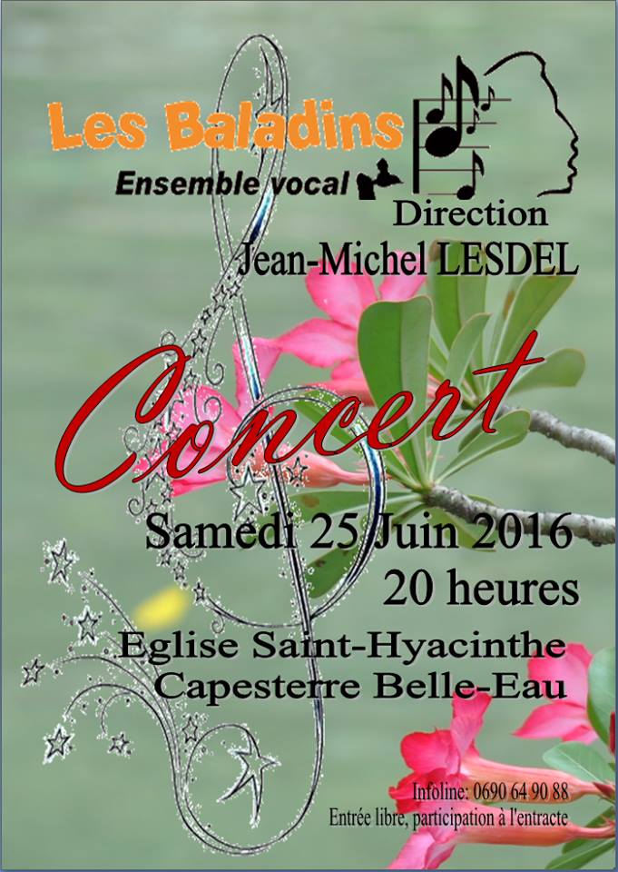 Après s’être produit aux Abymes, à Basse-Terre, Sainte-Anne et Pointe-Noire, c’est à l’Eglise Saint-Hyacinthe de Capesterre Belle-Eau cette fois que l’Ensemble Vocal Les Baladins a le plaisir de vous convier au Concert de Musique Classique et Sacrée qui sera donné le Samedi 25 juin 2016 à 20 h, pour clôturer la tournée de leur Saison Musicale 2015-2016 .