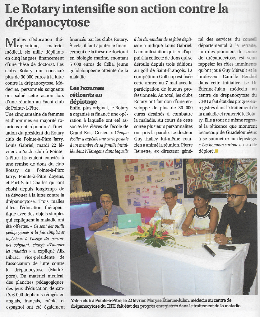 Le Rotary intensifie son action contre la Drépanocytose JEAN-CLAUDE HALLEY Actualité, Drépanocytose, Rotary 1 mars 2017 1 Minute Très belle page du courrier de la Guadeloupe sur l’action du Rotary. Partager : Cliquer pour partager sur X(ouvre dans une nouvelle fenêtre) X Cliquez pour partager sur Facebook(ouvre dans une nouvelle fenêtre) Facebook J’aime chargement… Similaire Publié par JEAN-CLAUDE HALLEY Retraité, tout un programme Voir tous les articles par JEAN-CLAUDE HALLEY Publié 1 mars 2017