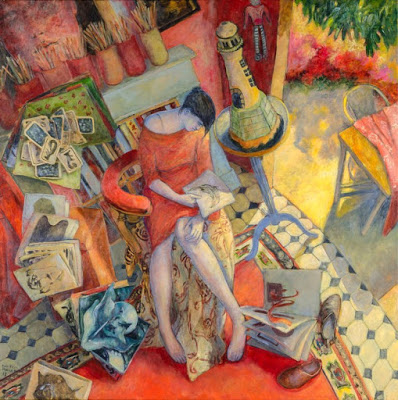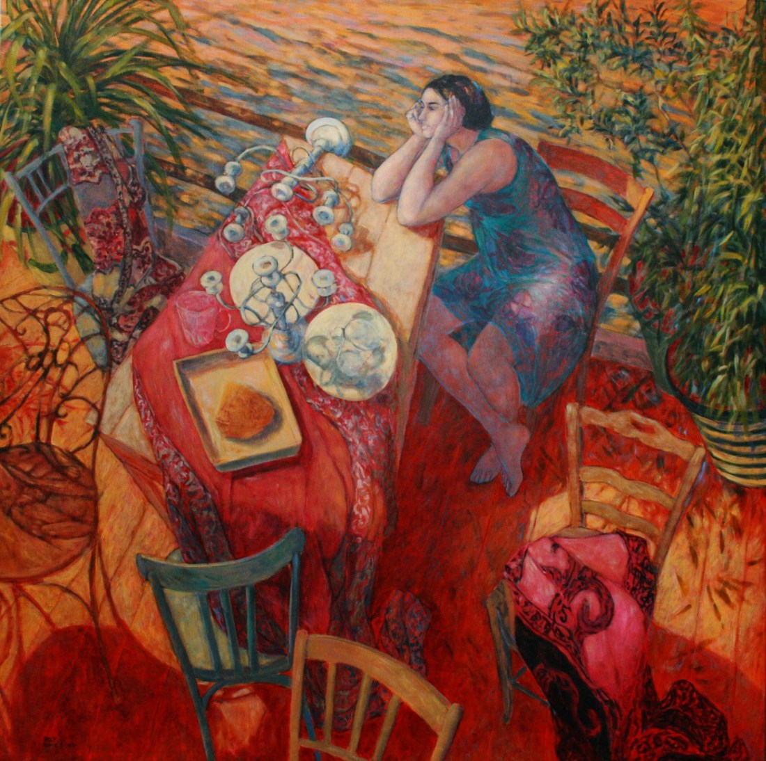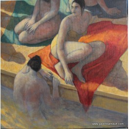 Et ne cesse de regarder ses filles. Ces belles jeunes femmes aux cheveux noirs, le corps mince, la peau mate. Sensuelles. Toujours tournées vers la chaleur. Celle du soleil ou de l’âtre. Toujours dans des attitudes de repos. Etendues sur un divan, négligemment appuyées sur une table , allongées sur une plage. Loin d’une représentation du corps meurtri. Loin d’une figure blessée.