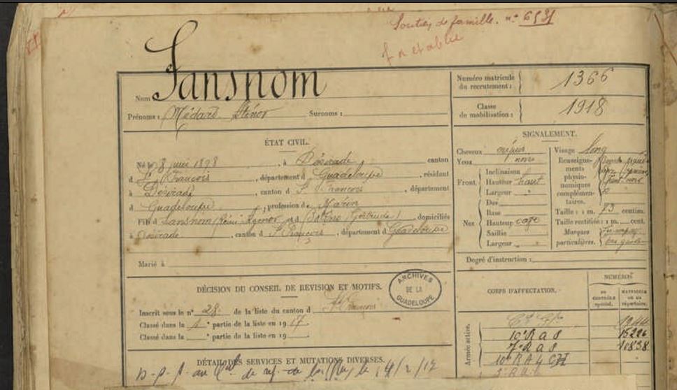 Une belle découverte de Madame Charlotte VANGOUT : un soldat brillant, originaire de la Désirade, et dont le patronyme est « SANSNON Médard Aténor »