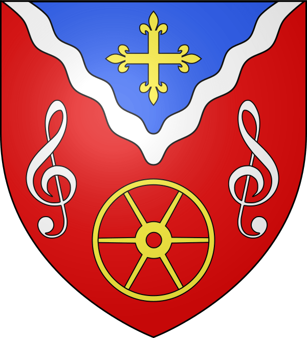 De gueules à la roue de chariot d’or accostée de deux clefs de sol d’argent, au chef triangulaitre ondé et soutenu d’argent, chargé d’une croisette fleuronnée d’or.