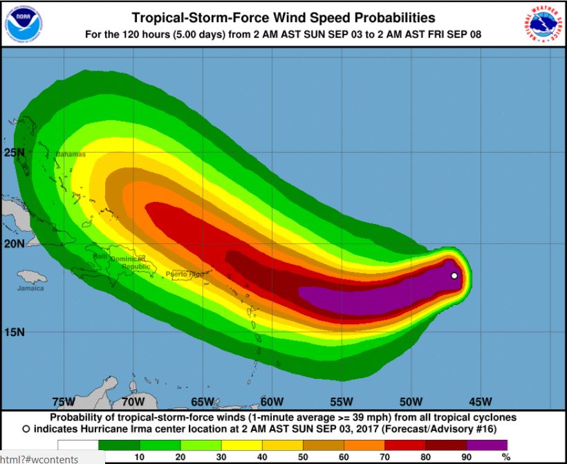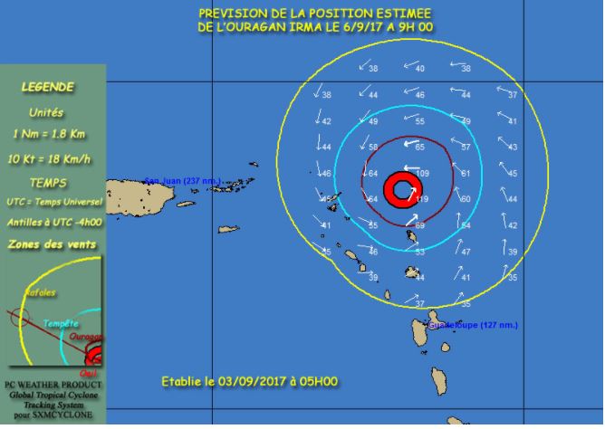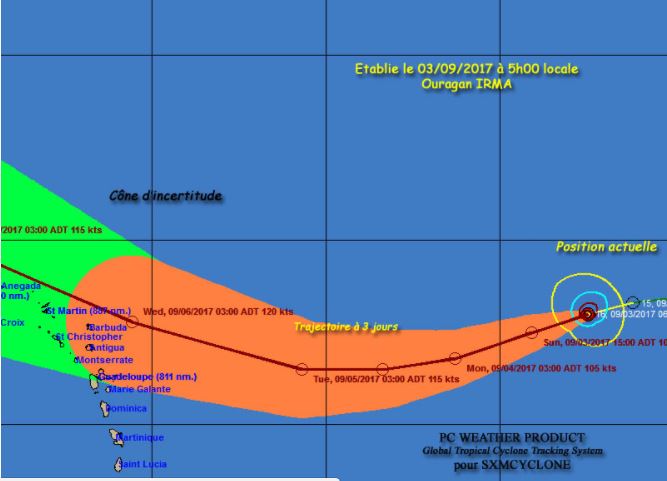 Irma entame une descente contrainte par une forte zone de haute pression. Sa position ce jour est de 18° N 47,5 O soit 1 600 Km de la Guadeloupe.