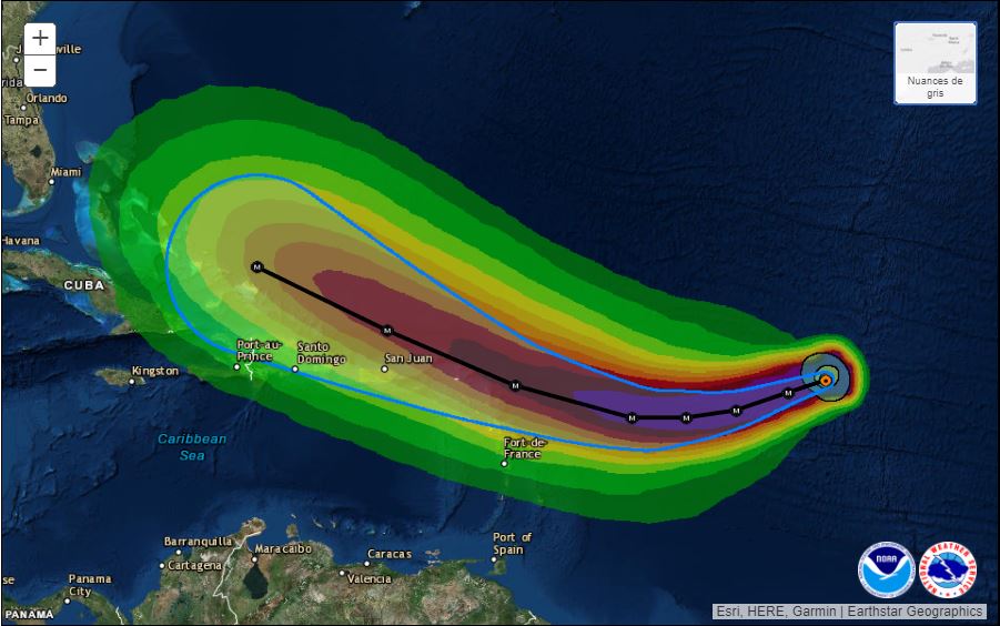 Elle passera à 17.8 N et 60 O soit à 250 km au NO de la Guadeloupe.