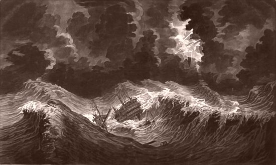 « Dès que le jour permit de distinguer les objets, le narrateur se rendit non sans peine sur le quai. La pluie, chassée avec une assez grande violence pour faire du mal à la peau, était tellement épaisse, qu’on pouvait à peine distinguer les objets au delà du bout du môle. La scène qui s’offrit à lui était d’une majesté indescriptible ; des vagues gigantesques roulaient sur la plage et semblaient vouloir tout engloutir ; cependant, elles brisaient sur le carénage où elles venaient se perdre, leur surface étant entièrement couverte d’épaves de toute nature. Deux bâtiments seuls étaient à flot en dedans de la jetée, tous les autres étaient chavirés ou échoués sur les petits fonds.
