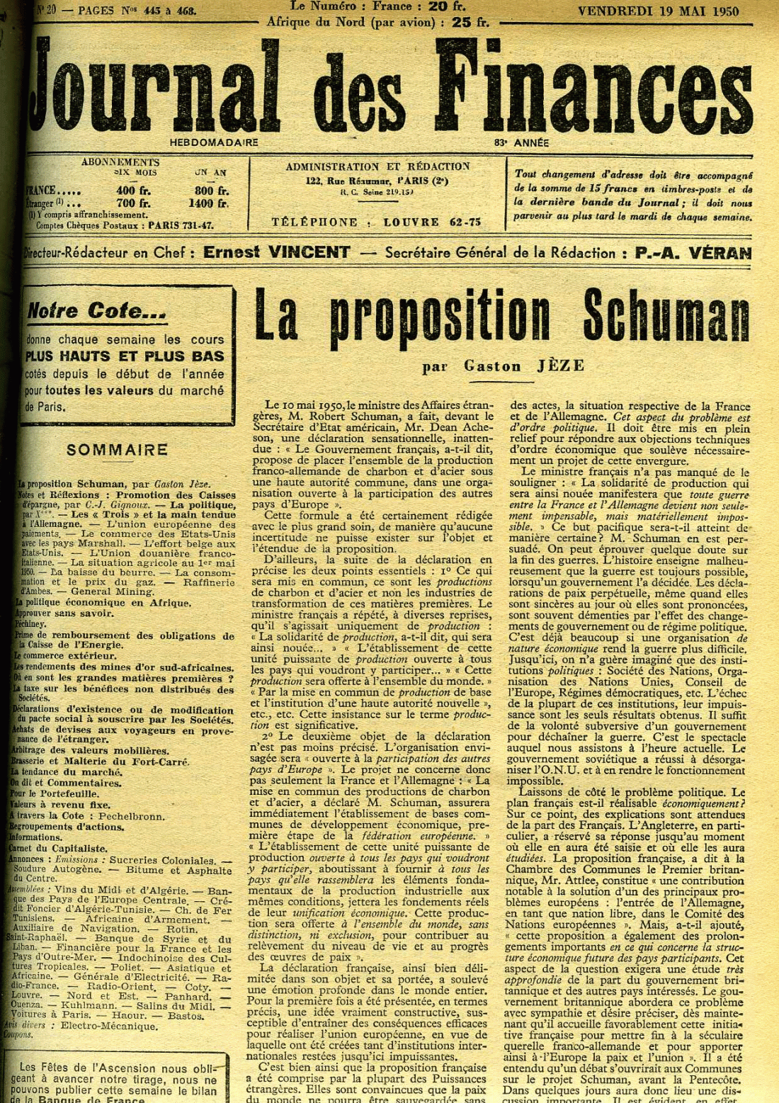 « La paix mondiale ne saurait être sauvegardée sans des efforts créateurs à la mesure des dangers qui la menacent. La contribution qu’une Europe organisée et vivante peut apporter à la civilisation est indispensable au maintien des relations pacifiques. En se faisant depuis plus de vingt ans le champion d’une Europe unie, la France a toujours eu pour objet essentiel de servir la paix. L’Europe n’a pas été faite, nous avons eu la guerre. L’Europe ne se fera pas d’un coup, ni dans une construction d’ensemble : elle se fera par des réalisations concrètes, créant d’abord une solidarité de fait.